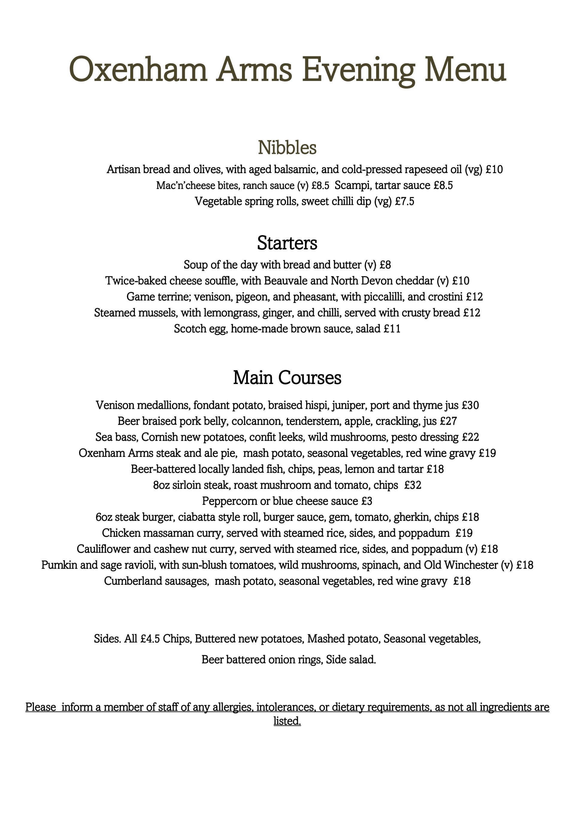 The Oxenham Arms Hotel AA Rosette Evening Dinner Menu
