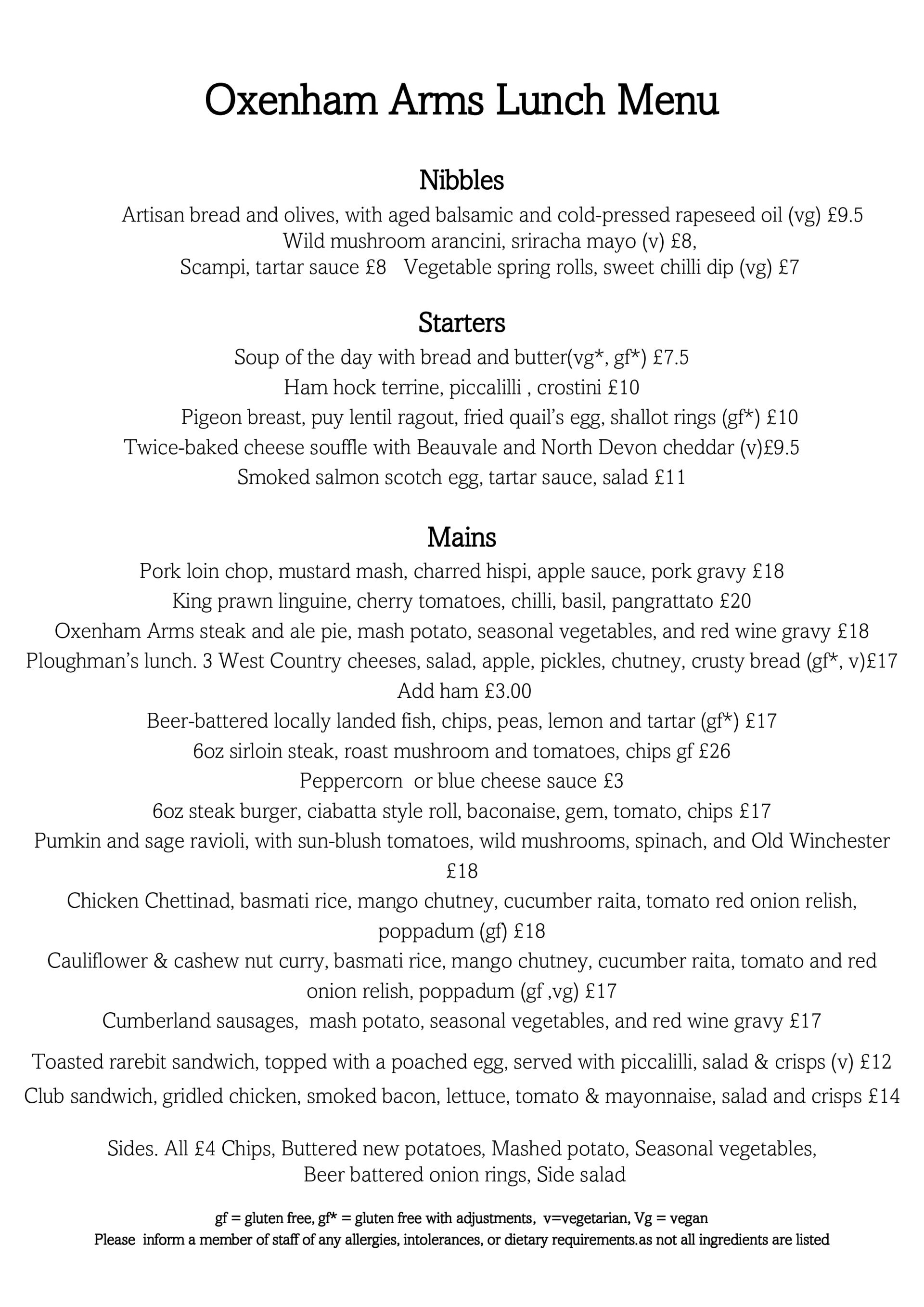 The Oxenham Arms Hotel AA Rosette Lunch Menu
